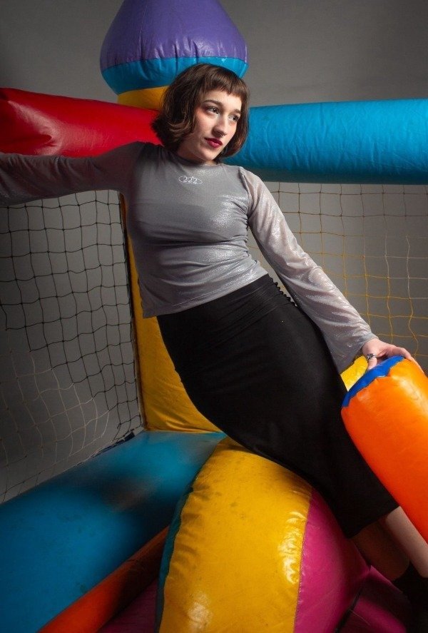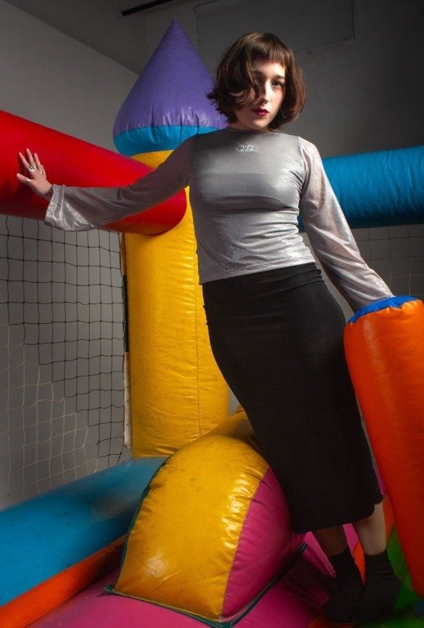 Remera de microtul elastizado con foil, el calce es al cuerpo hasta la cadera, el cuello botella y las mangas largas campana.
